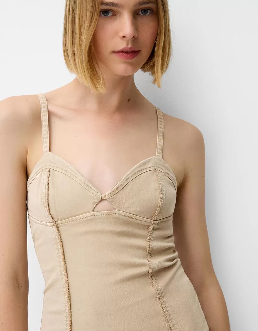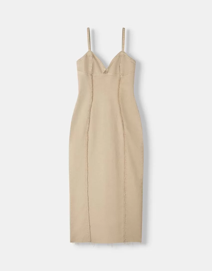 Abito midi in twill con spalline e dettagli di cuciture