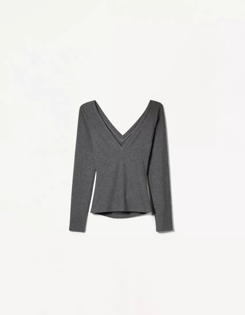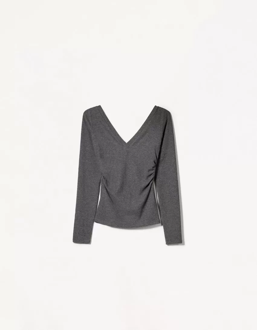 T-shirt a maniche lunghe con scollo a V arricciato